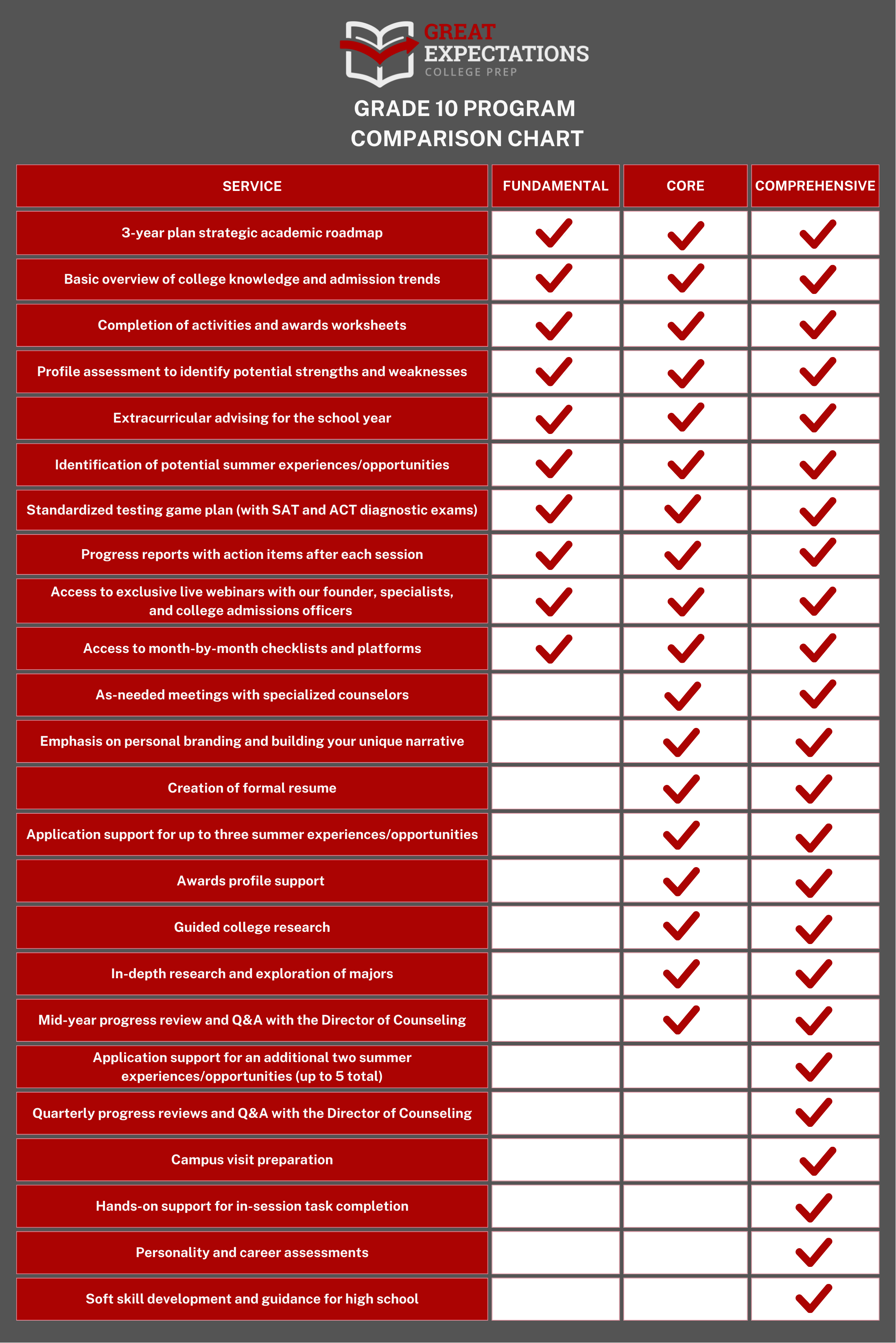 Fundamental programs are ideal for two types of students: 1) highly motivated, independent students who are already clear on their goals and interests, and who can complete strategic assignments between sessions to build/articulate/strengthen their personal brand and 2) students who simply want to make well-informed choices during high school and ensure they don’t overlook any important steps in the process. In both cases, after receiving personalized advice and instruction from their counselor, students are empowered to stay engaged, think critically, and give their best effort.