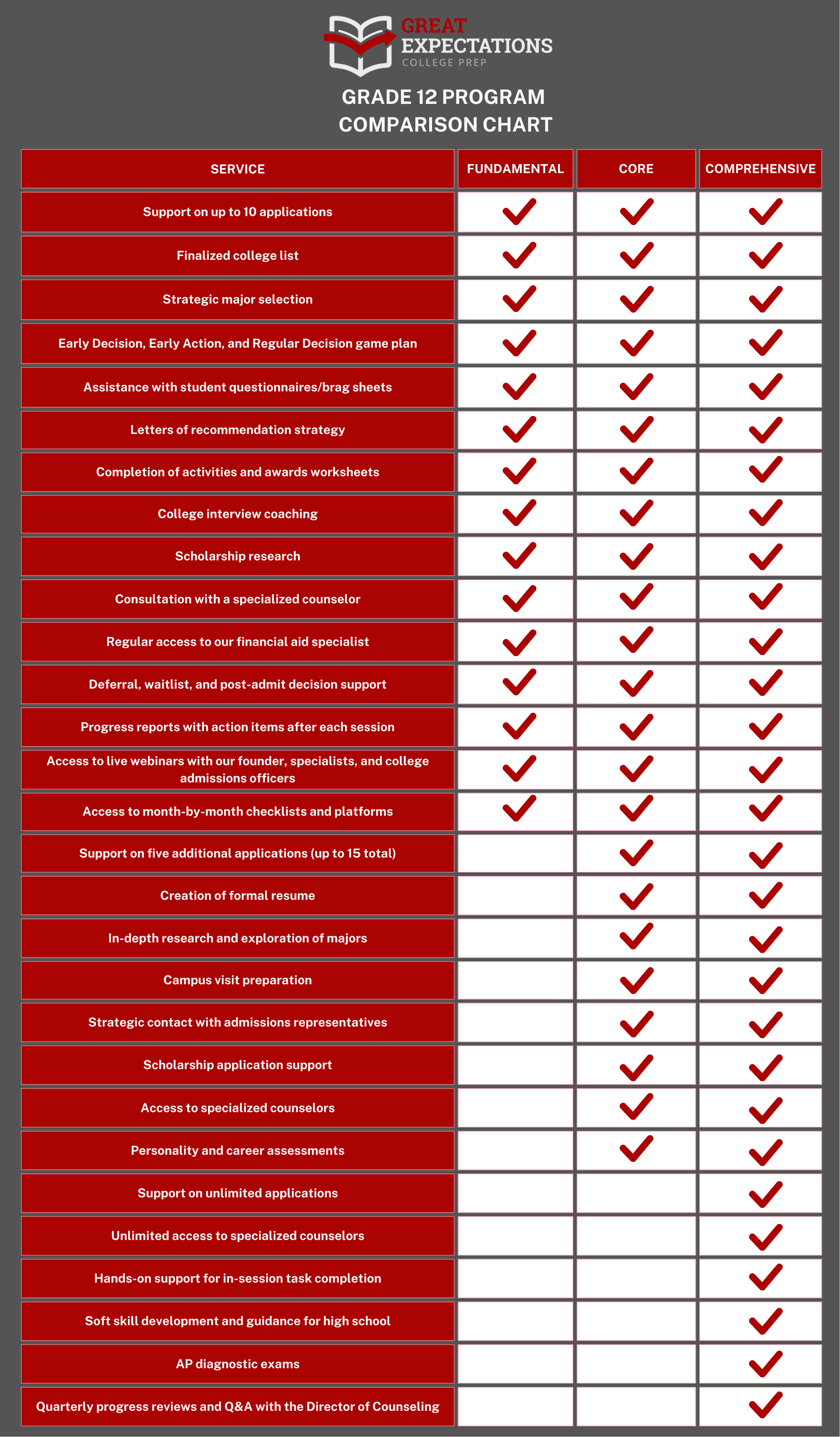 Comprehensive programs provide the most extensive level of support, including as-needed meetings and guidance that is both broader in scope and deeper in focus. These programs accommodate unlimited applications (including talent-based portfolios and auditions), a competitive school list, and difficult long-form essays. They are ideal for students who benefit from a highly hands-on, collaborative approach and want a strategic partner from start to finish, ensuring nothing gets overlooked or delayed. These programs allow for as many meetings as are necessary, as well as unlimited rounds of asynchronous edits.