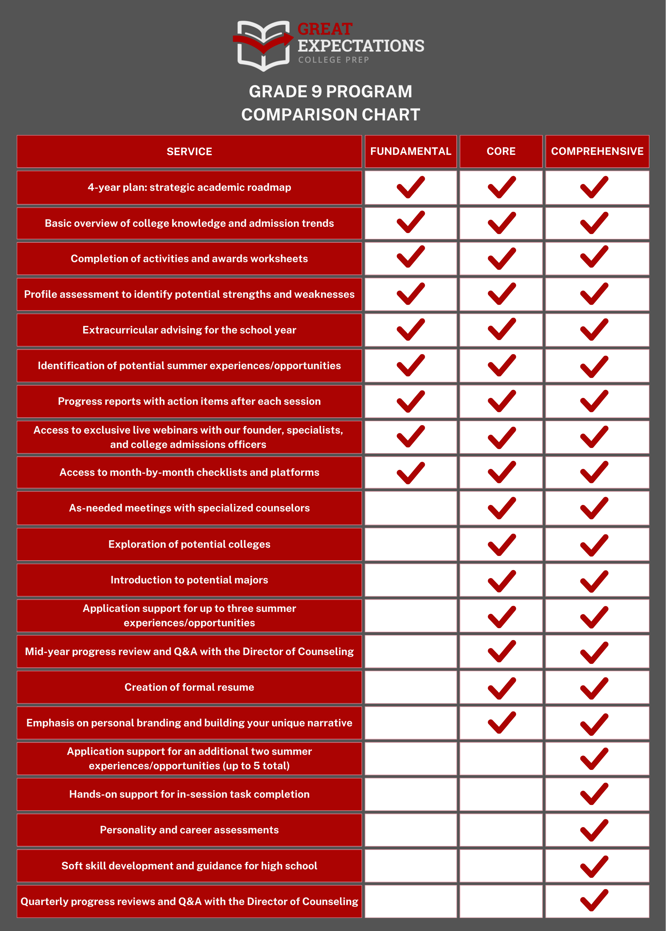 Fundamental programs are ideal for two types of students: 1) highly motivated, independent students who are already clear on their goals and interests, and who can complete strategic assignments between sessions to build/articulate/strengthen their personal brand and 2) students who simply want to make well-informed choices during high school and ensure they don’t overlook any important steps in the process. In both cases, after receiving personalized advice and instruction from their counselor, students are empowered to stay engaged, think critically, and give their best effort.